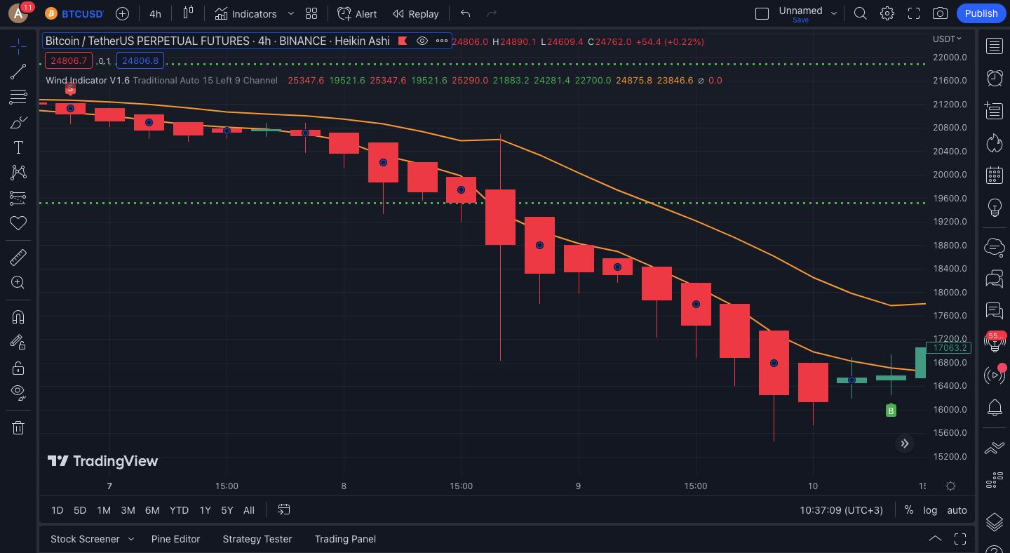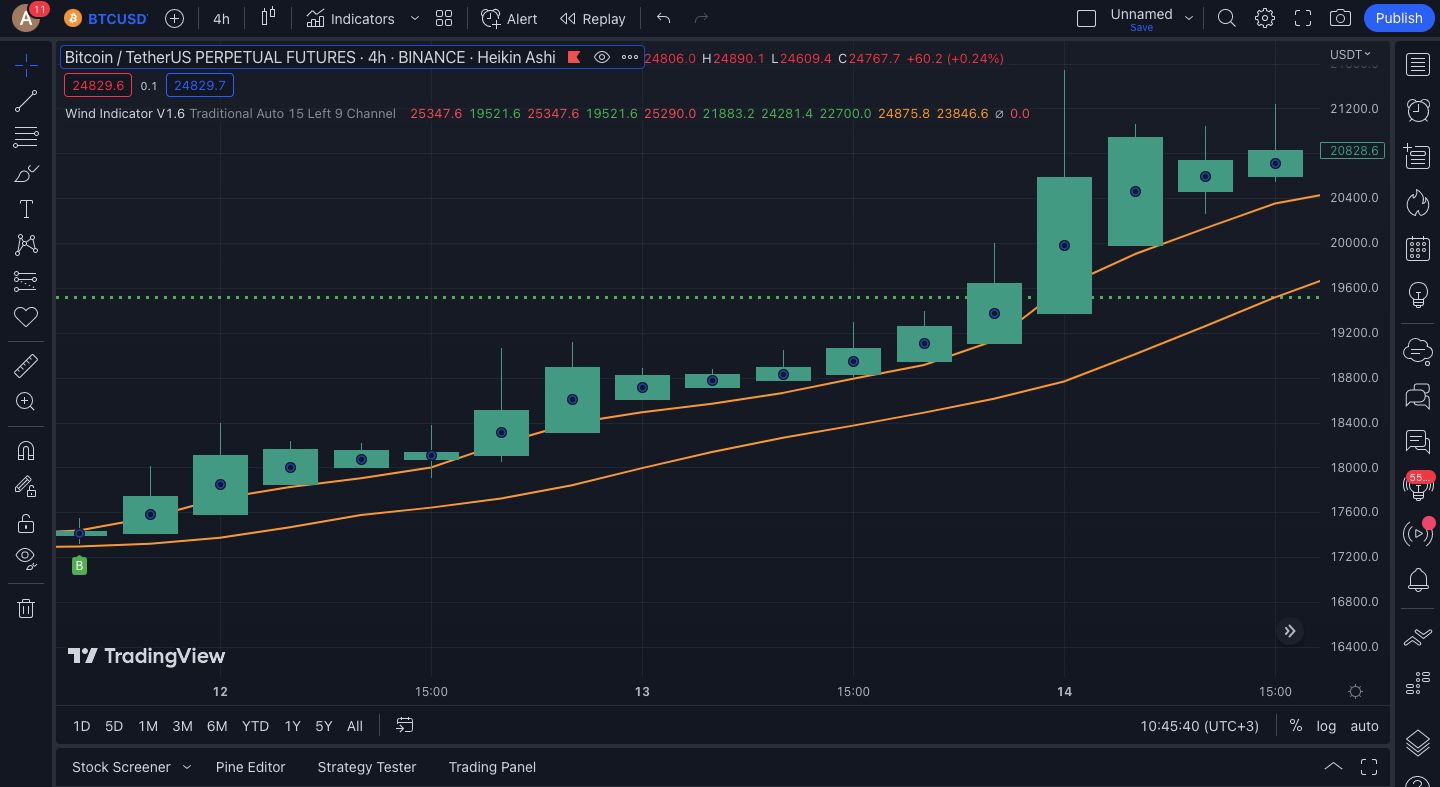 Real TradingView charts showing Wind Indicator V1.6 in action.